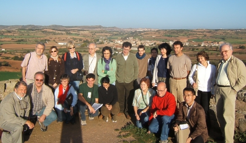 Una part de l’expedició, dalt la torre de la Manresana. Drets, d’esquerra a dreta: Francesc Castellet, Mireia Baylina, Carme Closas, Jordi Alberich, Ma. Carme Montaner, Francesc Nadal, Francesc i Maria Castellet, Roser Llongueres, Xavier Rosselló, Mercè Noguera i Joan Olivar. Asseguts, d’esquerra a dreta: Antonio Oliva, Enric Bertran, Assumpta Rovira, Breogán Lijó, Carolina Peña, Montserrat Nubiola (?), Joaquim Ma. Puigvert i Katsuyuki Takenaka. Al fons, una bonica panoràmica de l'Alta Segarra amb la vila dels Prats de Rei a primer terme i la de Calaf més lluny; fotografia de Jesús Burgueño.