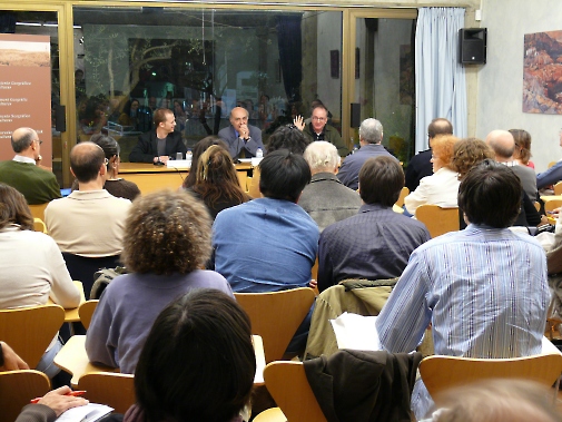 i els pintors, promoguda i duta a terme per la mateixa Fundació al llarg del 2006; la seva comissària, Mariona Seguranyes, va fer-ne una explicació in situ als assistents al Col·loqui. Seguidament va tenir lloc la presentació del segon bloc de comunicacions, sota l’enunciat de Geografía y Literatura. Estructurat com el primer bloc en dues parts, va ser coordinat, respectivament, pels professors Juan F. Ojeda i Agustín Hernando. Entre una part i l’altra es van llegir dotze comunicacions. Va posar fi a la segona jornada una activitat programada en el marc del Col·loqui però concebuda amb caràcter obert: la presentació pública del llibre d’Eliseu Carbonell Josep Pla: el temps, la gent i el paisatge. La presentació, seguida d’un breu col·loqui, va anar a càrrec del professor d’Antropologia Social Ignasi Terradas, de la Universitat de Barcelona, en acte presidit per Frederic Suñer, president de la Fundació Josep Pla [vegeu fotografia]. |