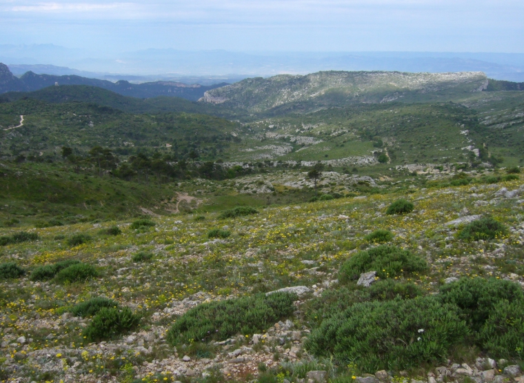...sovint la blanca roca calcària aflora, fondament clivellada, tot dibuixant paisatges desolats. Amb tot, a la primavera la roca nua resta amorosida per l’herba i les flors. |