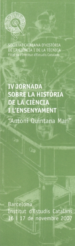 Programa provisional En la sessió inaugural es presentarŕ la Comissió d'Histňria de la Cičncia i Ensenyament de la SCHCT. A continuació es llegiran les comunicacions, seguides dels debats corresponents. Durant el desenvolupament de la Jornada es durŕ a terme el lliurament del VI Premi Antoni Quintana Marí per a treballs de recerca de batxillerat. La comunicació definitiva del programa, la distribució de les comunicacions i altres detalls sobre l'organització de la Jornada es faran cončixer a través de la pŕgina web de la SCHCT (http://schct.iec.cat) a partir del 2 de novembre de 2007. Lloc de celebració: Residčncia d'Investigadors, carrer de l'Hospital, 64, Barcelona. |