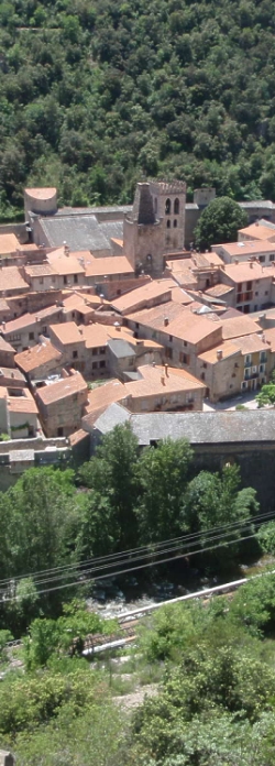Des de la bateria situada a mig camí del Fort Libèria s’obtenen les millors vistes de Vilafranca de Conflent. A la imatge la part occidental de la vila, presidida per l’església de Sant Jaume (campanar quadrat). També hi destaquen les torres de la casa del Veguer, avui ajuntament (torre amb punxa) i de l’Hospital (a l’esquerra). Fora muralla s’observa la via del carrilet. |