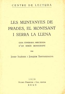 | Josep Iglésies i Joaquim Santasusagna: Les muntanyes de Prades, el Montsant i serra la Llena: guia itinerària precedida d’un esbós monogràfic. Reus: Ricard Ferreter i Gili, 1929; 366 pp. + làms. + 1 mapa pleg. | Ressenya de P. Vila (1929) : pàg. 1 · 2 · 3 · 4 |