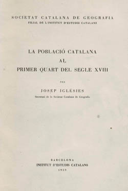 | Josep Iglésies: La població catalana al primer quart del segle XVIII. Barcelona: Societat Catalana de Geografia, 1959; 44 p. | Ressenya de S. Llobet (1959) : pàg. 1 · 2 |