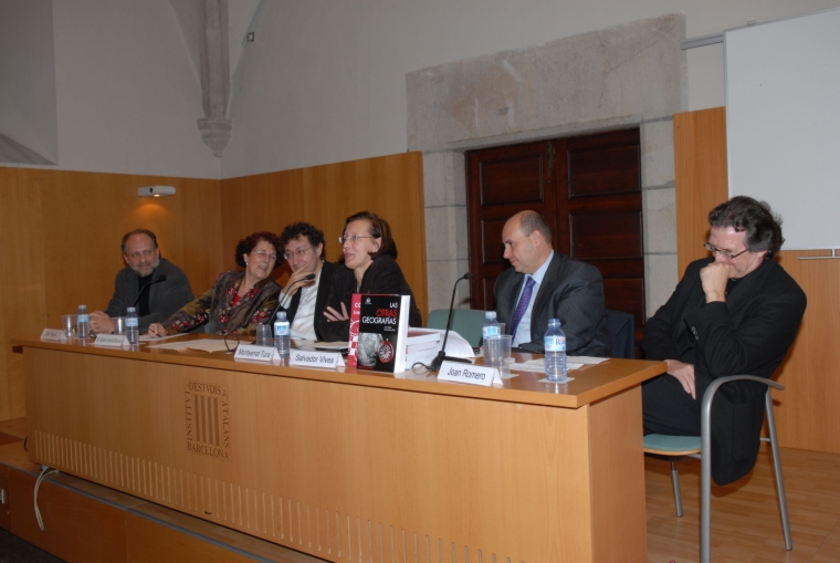 El primer a parlar va ser Salvador Vives, qui va mostrar dues característiques formals del llibre: la primera, l’encert del títol, perquè mostrava una mirada nova sobre una disciplina de sempre; la segona, el fil conductor donat pels editors, malgrat la gran quantitat d’autors i de textos diferents. Justament aquestes dues característiques van ser també els eixos de les paraules de Maria Dolors Garcia Ramon, qui va començar remarcant que aquest tipus de llibres són una rara avis en la geografia espanyola, ja que “estem vivint temps precaris, hostils i incerts que necessiten noves respostes”, i el llibre Las otras geografías és un text “atractiu, poc convencional, agosarat, crític, que dóna veu a aquells qui no en tenen”. Maria Dolors Garcia Ramon va fer un repàs de la introducció i de les quatre parts del llibre. De la introducció va esmentar la idea que “els ciutadans seran més lliures si aprenen a interpretar l’espai”, i per això, en el nou desordre mundial en què vivim és necessari estudiar allò que és invisible, intangible i efímer. Del primer bloc, que tracta sobre les noves problemàtiques territorials derivades de la globalització, va ressaltar el capítol redactat per Mireia Folch-Serra sobre la geografia del terrorisme i de les diferents escales territorials que s’han d’utilizar per intentar comprendre accions tan incomprensibles, i que han dut a la creació d’una societat de la por. Del segon bloc va |